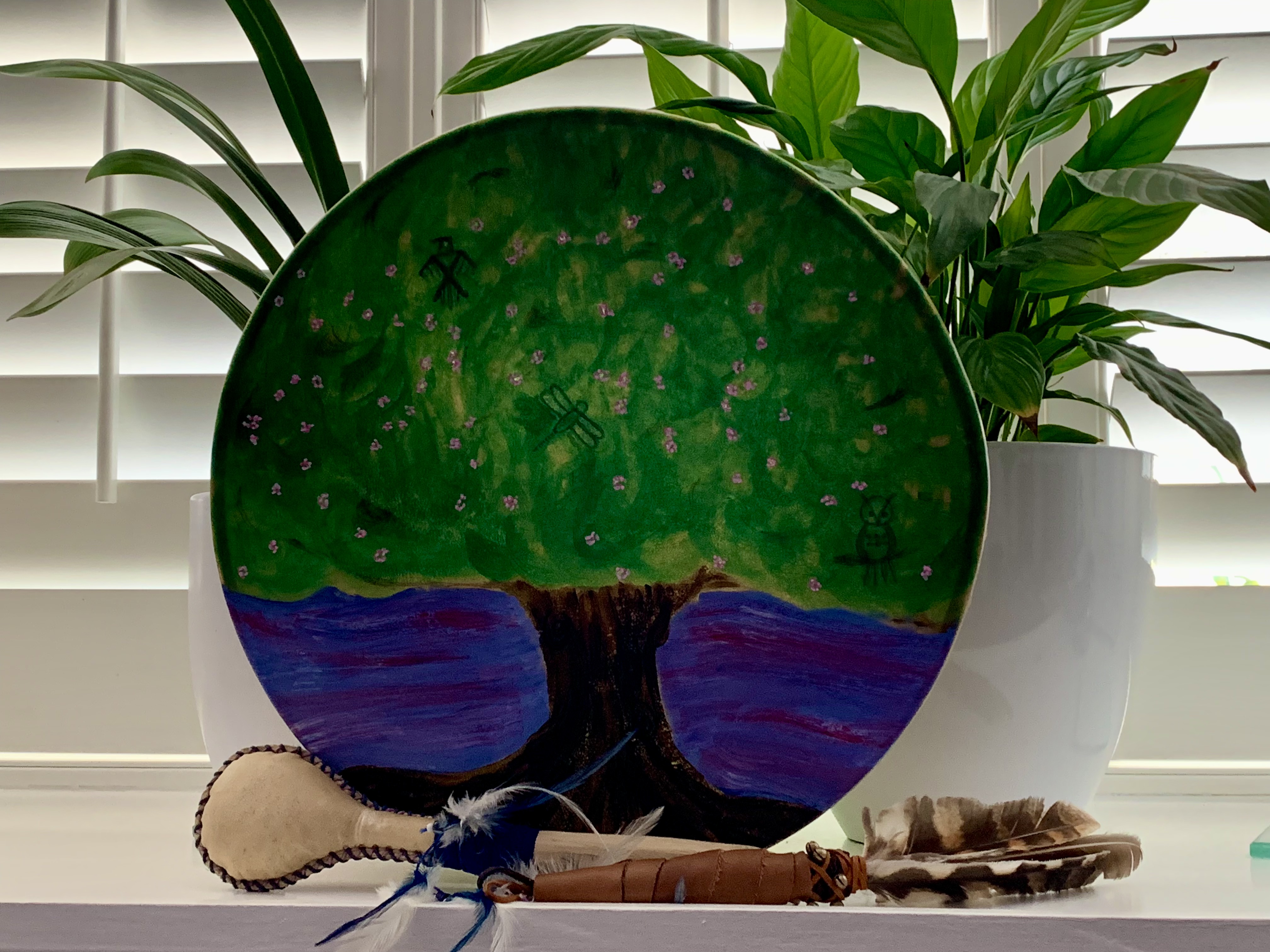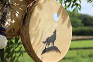 Songbird was my first drum. I made her as part of the Ceremonial Drumming course which I studied with Mike Barron through The College of Sound Healing in 2020. Part of the course required us to make our own drum, rattle and beater using traditional Inipi Lodge techniques. Songbird is a double sided drum representing Yin and Yang. It was such a sacred and rewarding experience – creating a beautiful instrument using the same methods as my ancestors.